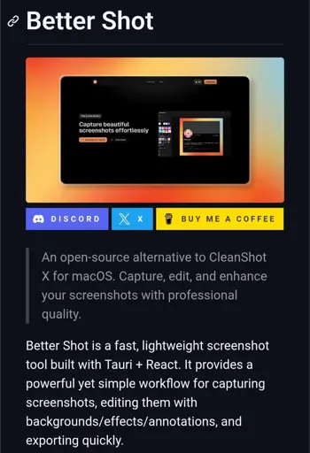xabd@sh.itjust.worksMEnglish · 3 days agoBetter Shot — Open-source alternative to CleanShot X (macOS)sh.itjust.worksimagemessage-square1linkfedilinkarrow-up13arrow-down10