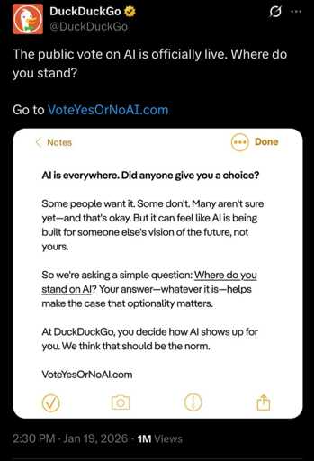arrow-up115arrow-down1imageDuckDuckGo Pushes Back on Forced AI, Asks Users If AI Should Be Optionalsh.itjust.worksxabd@sh.itjust.worksMEnglish · 15 hours agomessage-square7linkfedilink