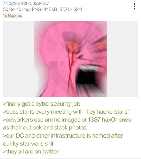 That is the exact opposite of my experience. Of all the coworkers and friends I’ve ever had who worked in cybersecurity, one was a bootlicker, while all of the rest were at least three of transfem, furry, weeb, and anarchist.