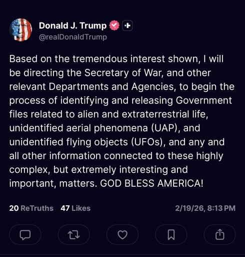 They can’t even release the Epstein files, what makes anyone believe they’ll release the Alien files lol. Pathetic distraction. Release the Epstein files.