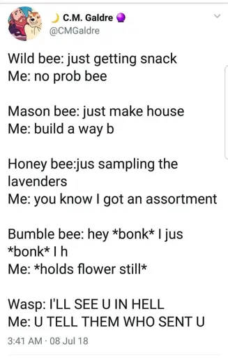 Sincerely — a pest control technician who is incredibly tired of helping solve “bee” problems, when 99% of the time, they have a Wasp problem.