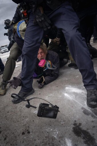 Photo by Pierre Lavie. Yes this is me. And I threw my Leica. It landed on the bass plate with hardly a scratch. Another photographer grabbed it along with my phone and I was able to track him later. I was held face down tear gas deployed right in front of me and pepper sprayed directly into the eye.