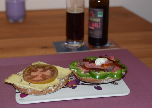 Vinschgauer is a type of bread roll from South Tyrol made from rye-wheat-sourdough, seasoned with blue fenugreek, coriander, fennel and caraway. Topped with local raw-milk cheese and tomato / green bell pepper and roast-beef with remoulade. Accompanied by a (non-alcoholic) malt-beer.