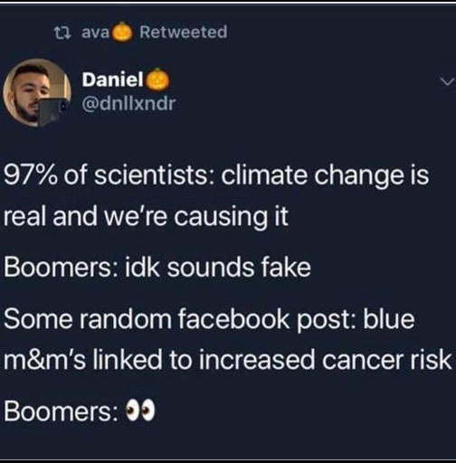 If they accept climate change, it means they have to acknowledge that their actions helped cause this and it means they need to change their behavior. People aren’t good at either but most Boomers especially suck at self-reflection.