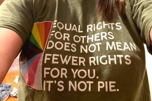 Koons’s T-shirt featured half a rainbow pie, with the slogan: “Equal rights for others does not mean fewer rights for you. It’s not pie.”