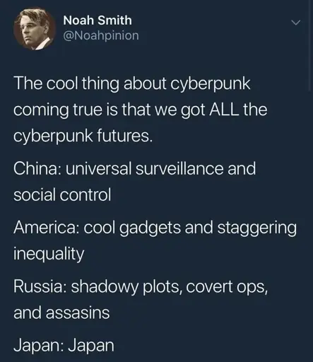 Stamets@lemmy.dbzer0.com to People Twitter@sh.itjust.works · 4 days agoCyberpunk 2026lemmy.dbzer0.comimagemessage-square26linkfedilinkarrow-up1469arrow-down111