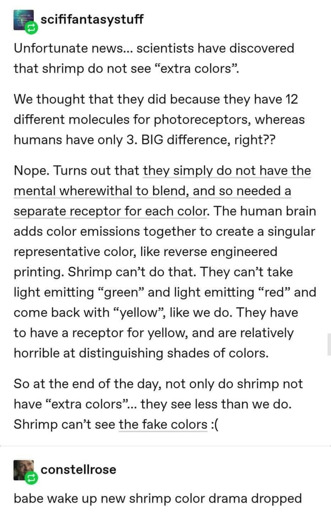 Also, mantis shrimp have 6 more photoreceptors in addition to the 12 colored ones, to detect polarized light. They likely see them the same way that they see color, so they probably don’t consider them anything different than wavelength which is what we interpret as color.