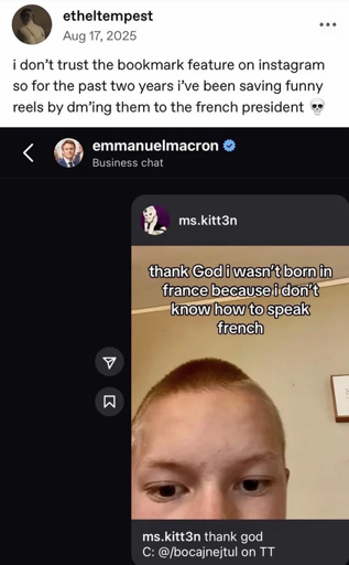 Tumblr post by etheltempest saying “i don’t trust the bookmark feature on instagram so for the past two years i’ve been saving funny reels by dming them to the french president”.