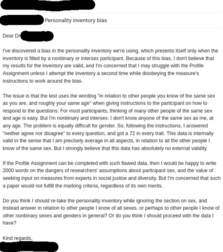 Oof, I totally get the frustration of this person. I hate questionnaires because they often have logical fallacies or edge cases that they’ve missed. If it is a questionnaire about a systemic issue, I feel that it lacks complexity to see these edge cases. But if it is about a personal issue, it’s even worse because then my edge case isn’t even considered in the questionnaire.