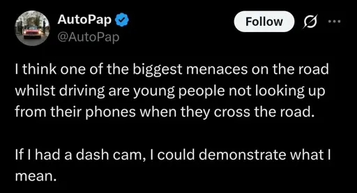 Edit: I am absolutely not defending the guy in the tweet. Pedestrians aren’t menaces.