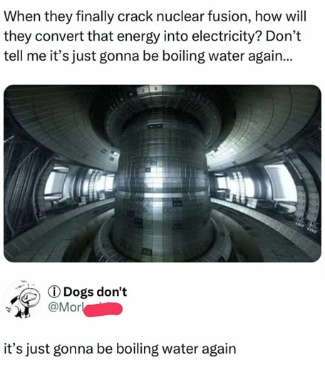 Most people seemingly don’t know that coal/gas stations work by essentially boiling water. Most are horrified at how trashy and underdeveloped the concept is compared to high tech alternatives like solar, wind, or hydro.