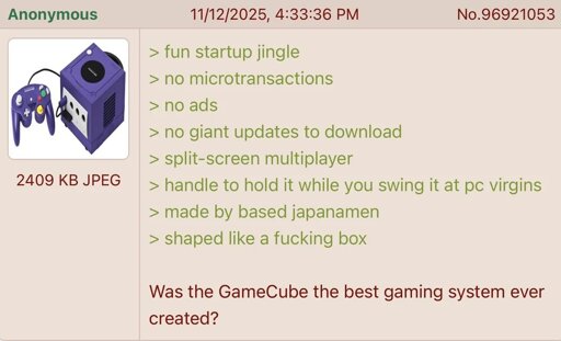 arrow-up14arrow-down1imageAnon remembers the GameCubesh.itjust.works🍹Early to RISA 🧉@sh.itjust.worksM to Greentext@sh.itjust.works · 3 months agomessage-square2linkfedilink