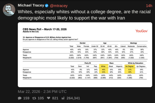 powerstruggle@sh.itjust.worksM to stupidpol@sh.itjust.works · 4 days agoWhites, especially whites without a college degree, are the racial demographic most likely to support the war with Iransh.itjust.worksimagemessage-square4linkfedilinkarrow-up120arrow-down12file-text