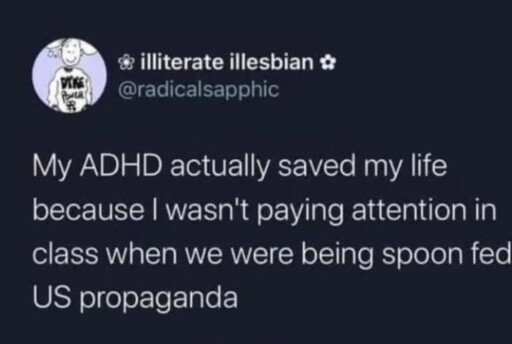 arrow-up1806arrow-down1imageBetween church, school, & targeted advertising my inability to focus has probably helped me subvert more brain washing than I'll ever really know. Maybe it's not so maladaptive in this dystopia?sh.itjust.worksBasic Glitch@sh.itjust.works to ADHD memes@lemmy.dbzer0.comEnglish · 12 days agomessage-square72linkfedilink
