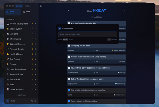 Also, one of the top feature that I really wanted is global quick add shortcut. You can trigger it with cmd+shift+a on macos, ctrl+shift+a on windows/linux.