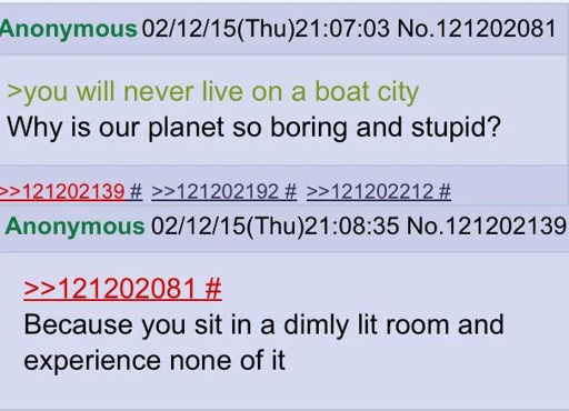I think everyone missed the actual greentext part and focused instead on the snarky comment, but there are, in fact, multiple cities in the world (including the US) where a significant number of people live on houseboats. Many large cities with a significant amount of waterways offer this option, such as Amsterdam, Hamburg, or Seattle. It’s sadly usually not cheap and comes with a number of drawbacks, but it IS possible and people do live there full-time.
