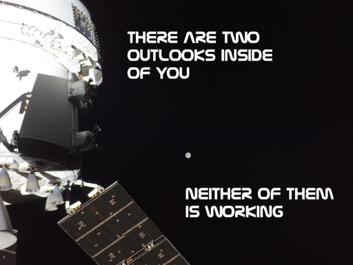 minus-squaresplendid9583@kbin.earthlinkfedilinkarrow-up6·5 days agohttps://www.tomshardware.com/software/microsoft-office/artemis-ii-astronaut-finds-two-outlook-instances-running-on-computers-call-on-houston-to-fix-microsoft-anomaly-puzzled-caller-describes-two-outlooks-and-neither-one-of-those-are-working
