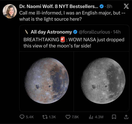 This make me sad, English major or otherwise. I mean, you can look up at the moon and see when the far side is at least partially illuminated.