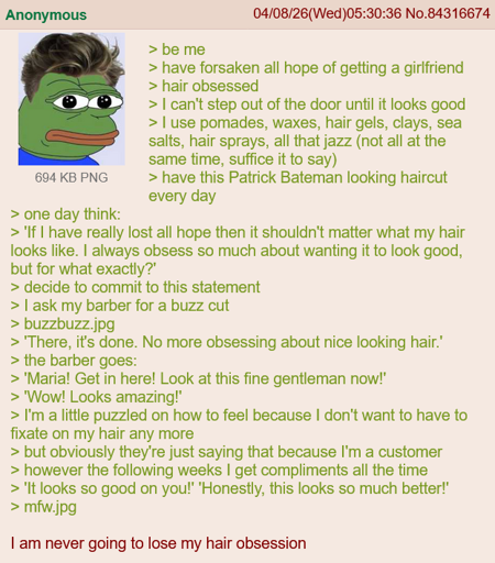 throwawaybanana@discuss.online to Greentext@sh.itjust.works · 5 days agoAnon is hair obsesseddiscuss.onlineimagemessage-square7linkfedilinkarrow-up1185arrow-down11