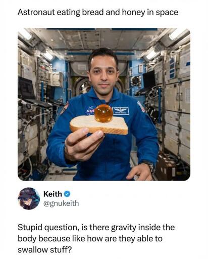 It’s even cooler than that: The esophagus can squeeze things towards the stomach against gravity. You can drink water while hanging upside down. You’ll also get a nose full of water because your sinuses would be below your mouth… But once it’s in your throat and you’re swallowing, it’ll make it to your stomach just fine.