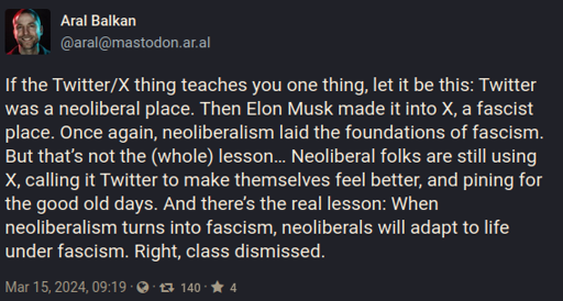 If the Twitter/X thing teaches you one thing, let it be this: Twitter was a neoliberal place. Then Elon Musk made it into X, a fascist place. Once again, neoliberalism laid the foundations of fascism. But that’s not the (whole) lesson… Neoliberal folks are still using X, calling it Twitter to make themselves feel better, and pining for the good old days. And there’s the real lesson: When neoliberalism turns into fascism, neoliberals will adapt to life under fascism. Right, class dismissed.