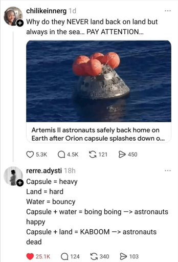 Astronaut: Oh crap, was blue water or land? Screw it, it’s land…oh noooooooo!!! Mr. Dolphin watch out!!!
