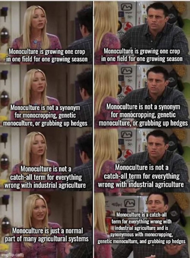 Monoculture is either the same crop on a field every time,