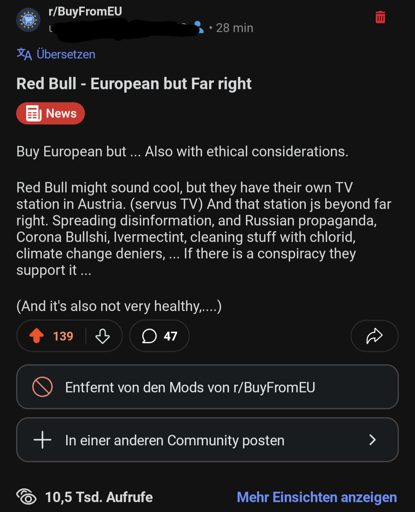 Red Bull might sound cool, but they have their own TV station in Austria. (servus TV) And that station js beyond far right. Spreading disinformation, and Russian propaganda, Corona Bullshi, Ivermectint, cleaning stuff with chlorid, climate change deniers, … If there is a conspiracy they support it …