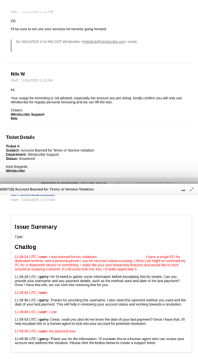 I did shoot them an email (after talking’ with their AI bot first), and they were actually helpful enough. The offered to restore support, so long as I promised to not torrent with them again (which, I honestly did promise not to. I’m not sticking with a VPN service that can’t handle me actually using it for what it’s advertised for) and they did unban the account. Whole email chain took about three days to get resolved.