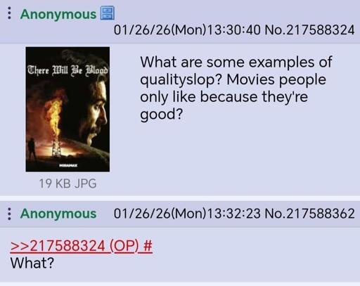 MutantTailThing@lemmy.world to Greentext@sh.itjust.works · 18 days agoAnon discusses cinema.lemmy.worldimagemessage-square20linkfedilinkarrow-up1178arrow-down19
