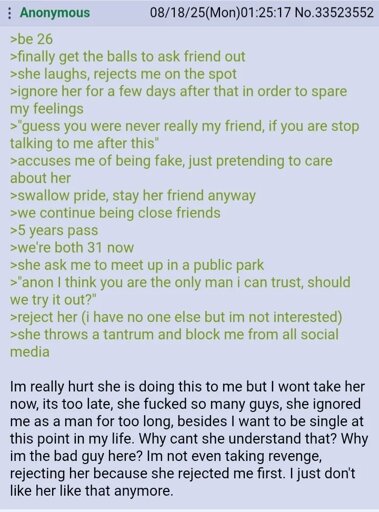 It’s pretty clear to me that anon carefully crafted this story, no matter how much of it is actually real, to cast himself in the best possible light and show this woman as evil. It’s telling that in doing so he didn’t even realize that it reflected poorly on him to shame her for having sex with someone who wasn’t him.