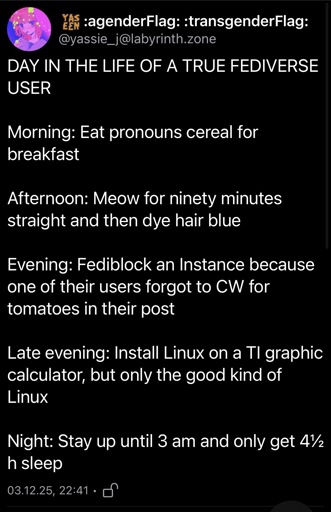 arrow-up16arrow-down1imageDay in the Life of a True Fediverse Usersh.itjust.worksSamskara@sh.itjust.works to Fediverse memes@feddit.ukEnglish · 3 months agomessage-square64linkfedilink